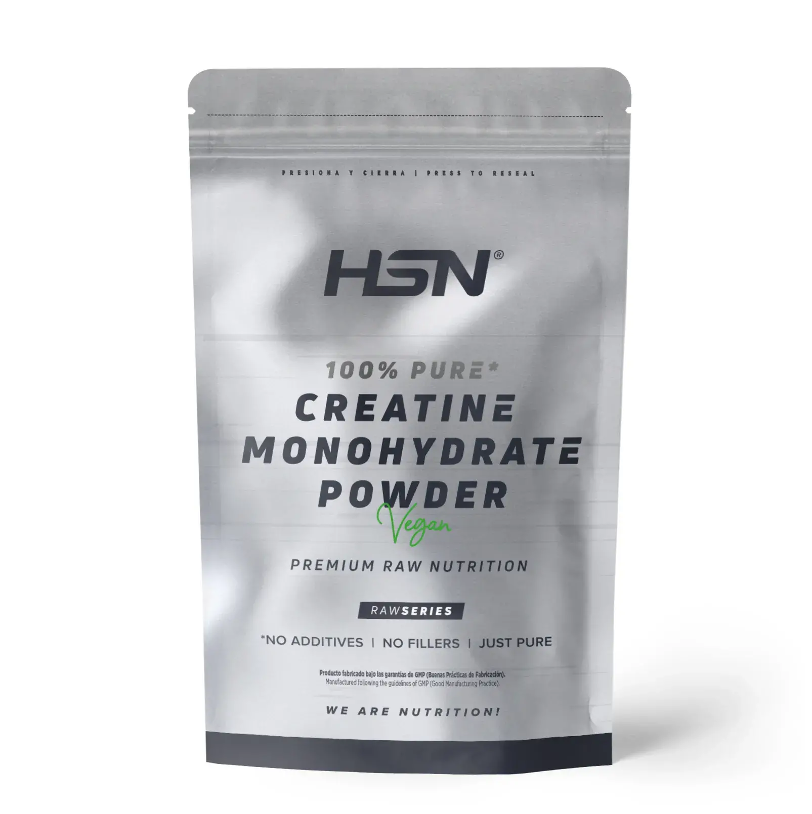 Creatina HSN: monohidrato 100% puro (muchas veces Creapure®), sin aditivos, vegana y sin gluten, diseñada para aumentar fuerza, potencia y rendimiento de forma segura y eficaz.